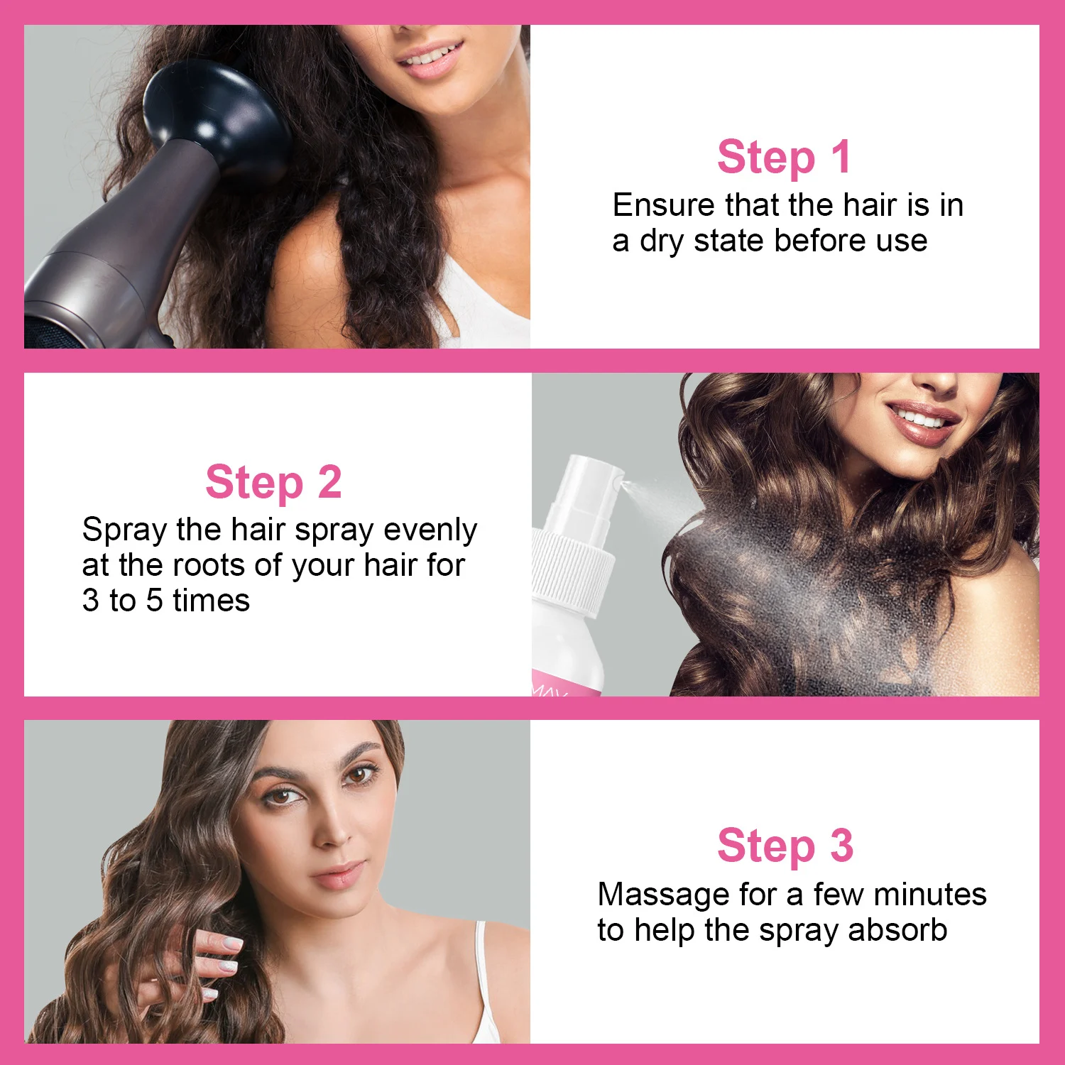 - Gently massage for a few minutes or comb through to help the spray absorb and distribute evenly.