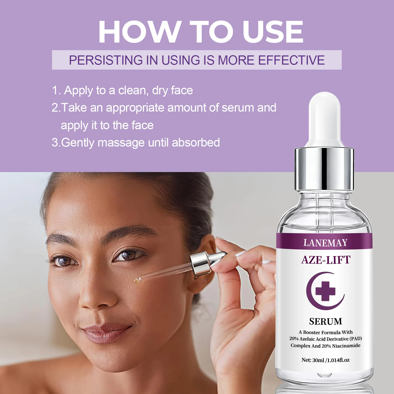 - Take an appropriate amount of the AZE-LIFT serum onto your fingertips.