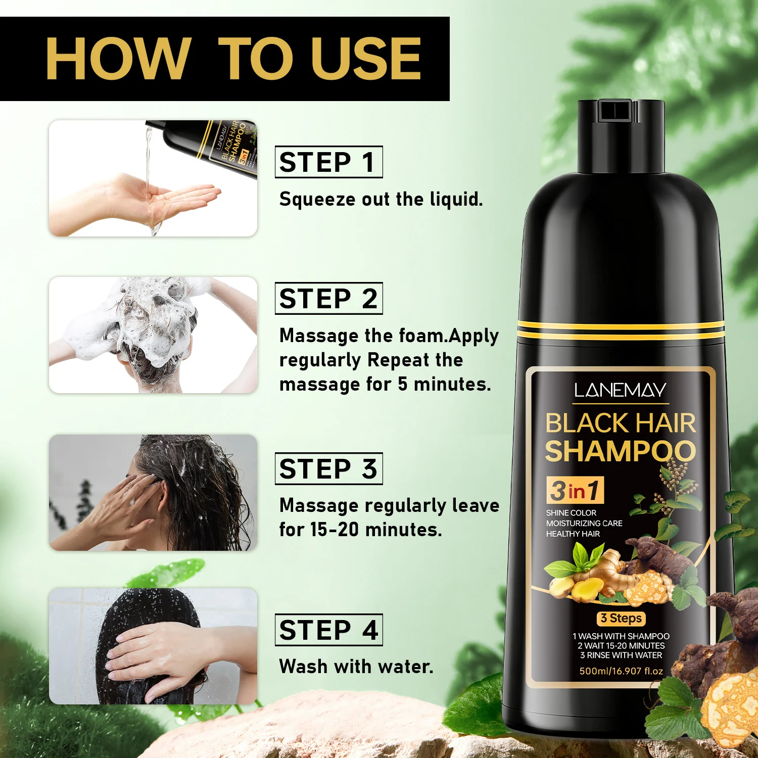 2. Application: Apply the shampoo to your hair and massage thoroughly to create a rich foam.