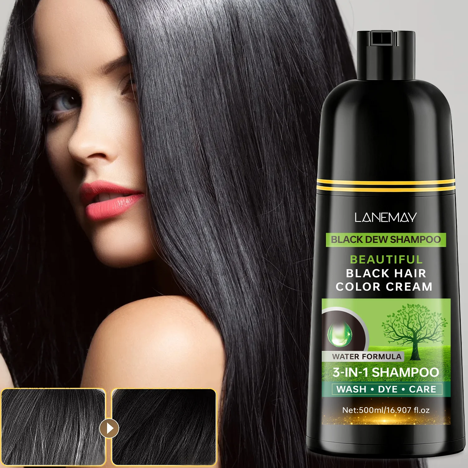 Say goodbye to gray hair in minutes! The LANEMAY 3-in-1 Black Hair Shampoo is a revolutionary water-based formula designed for those who want a quick, easy, and effective way to restore their hair’s youthful black luster. This all-in-one solution simplifies your routine by combining washing, dyeing, and nourishing into a single step.