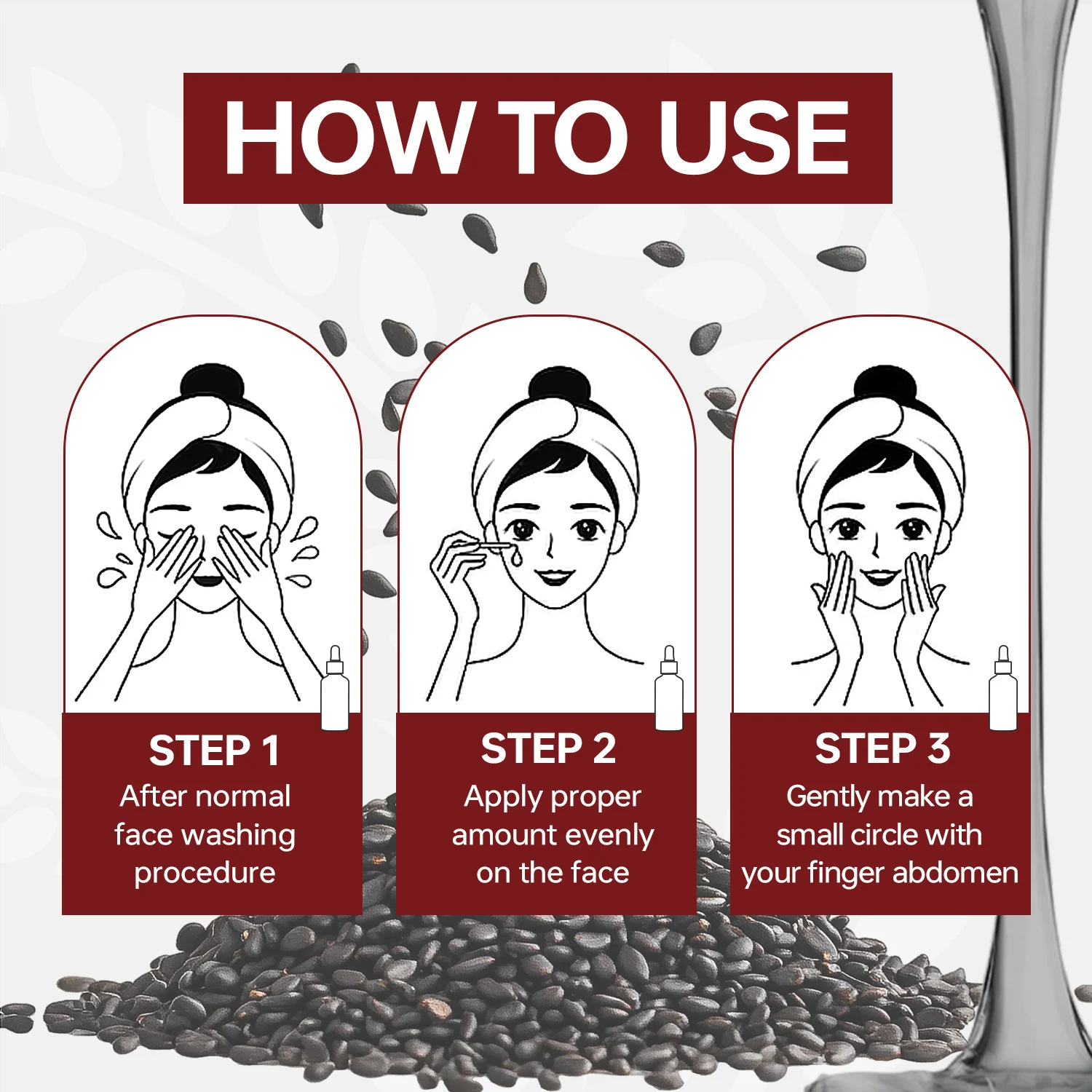 - Using your finger abdomen, gently massage the serum into the skin using small circular motions until fully absorbed.