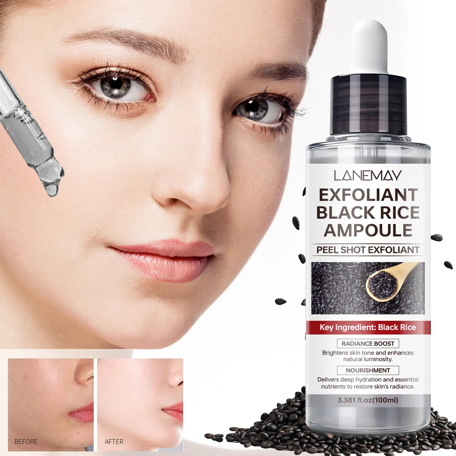 Experience the transformative power of fermented black rice with the LANEMAY Black Rice Ampoule Serum. This high-performance “Peel Shot” exfoliant is designed to breathe new life into dull, tired skin. It works by gently resurfacing the skin’s texture while delivering a potent dose of hydration and nutrients, leaving your complexion looking luminous, smooth, and revitalized.