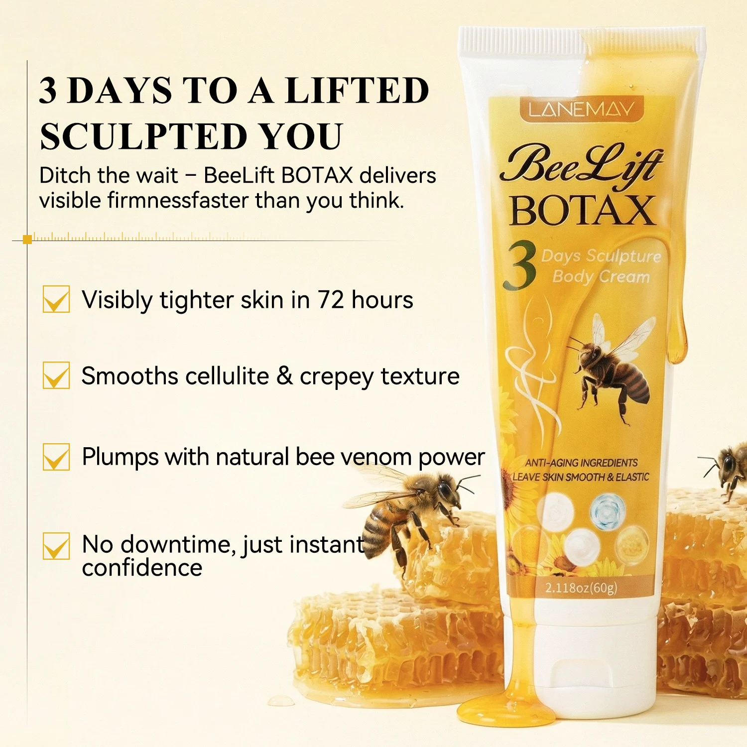 Experience a visible transformation with the LANEMAY BeeLift BOTAX Body Cream. Designed to deliver a sculpted and tighter appearance in as little as 72 hours, this advanced formula targets cellulite and crepey texture, leaving your skin feeling incredibly smooth, elastic, and youthful.