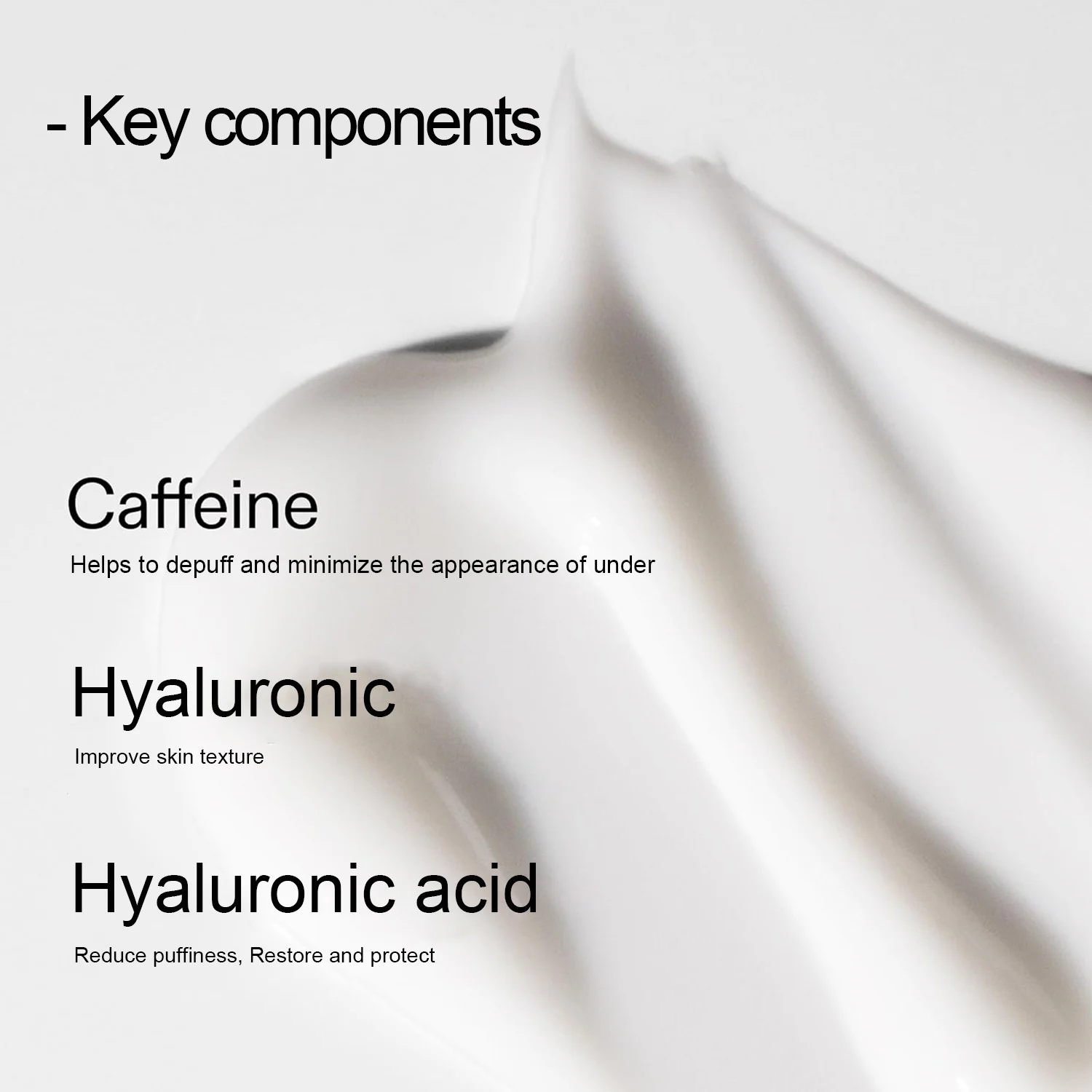 - Caffeine: A powerful antioxidant that helps to depuff and minimize the appearance of under-eye bags by improving microcirculation.