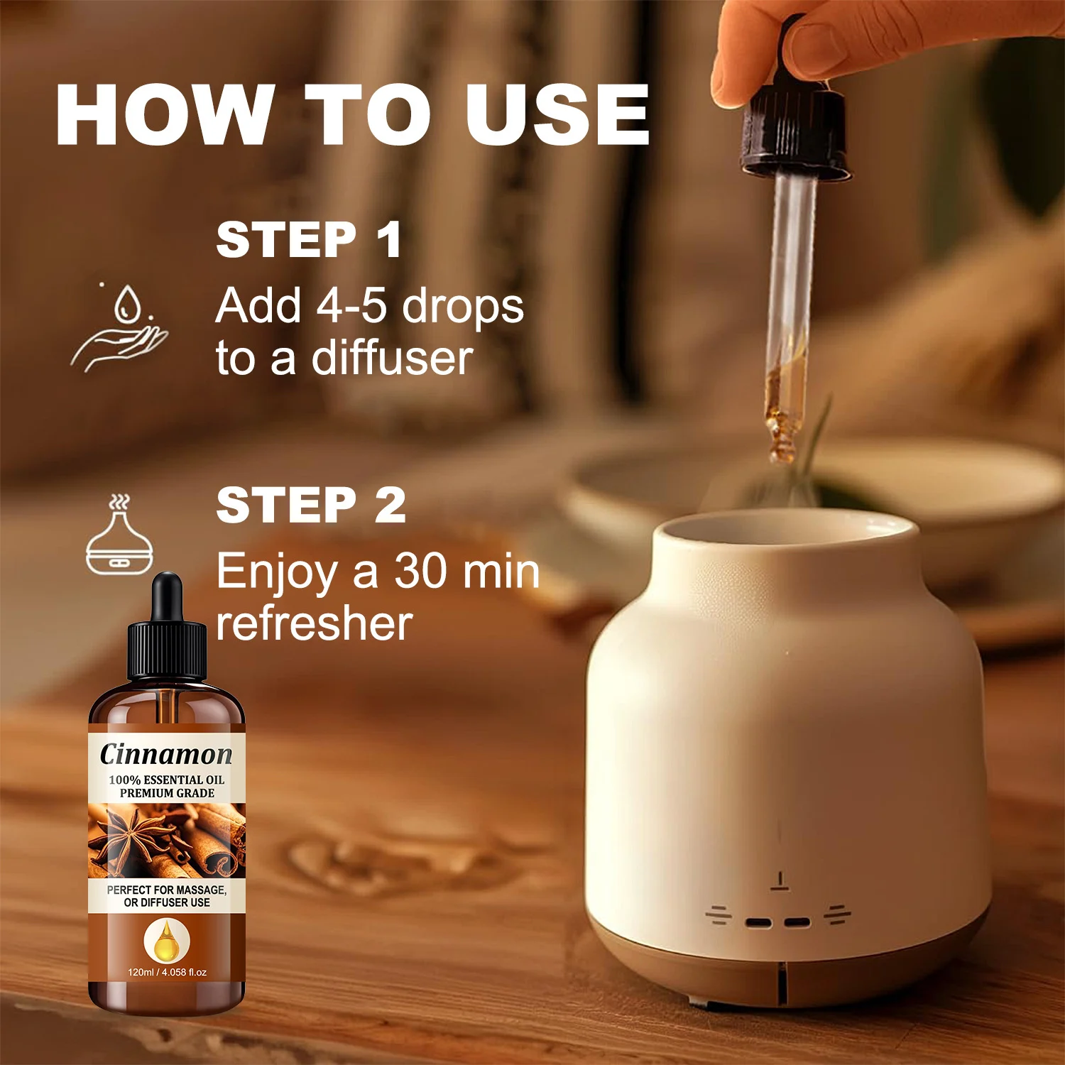 - Add 4-5 drops of Cinnamon Essential Oil to your water-filled diffuser.