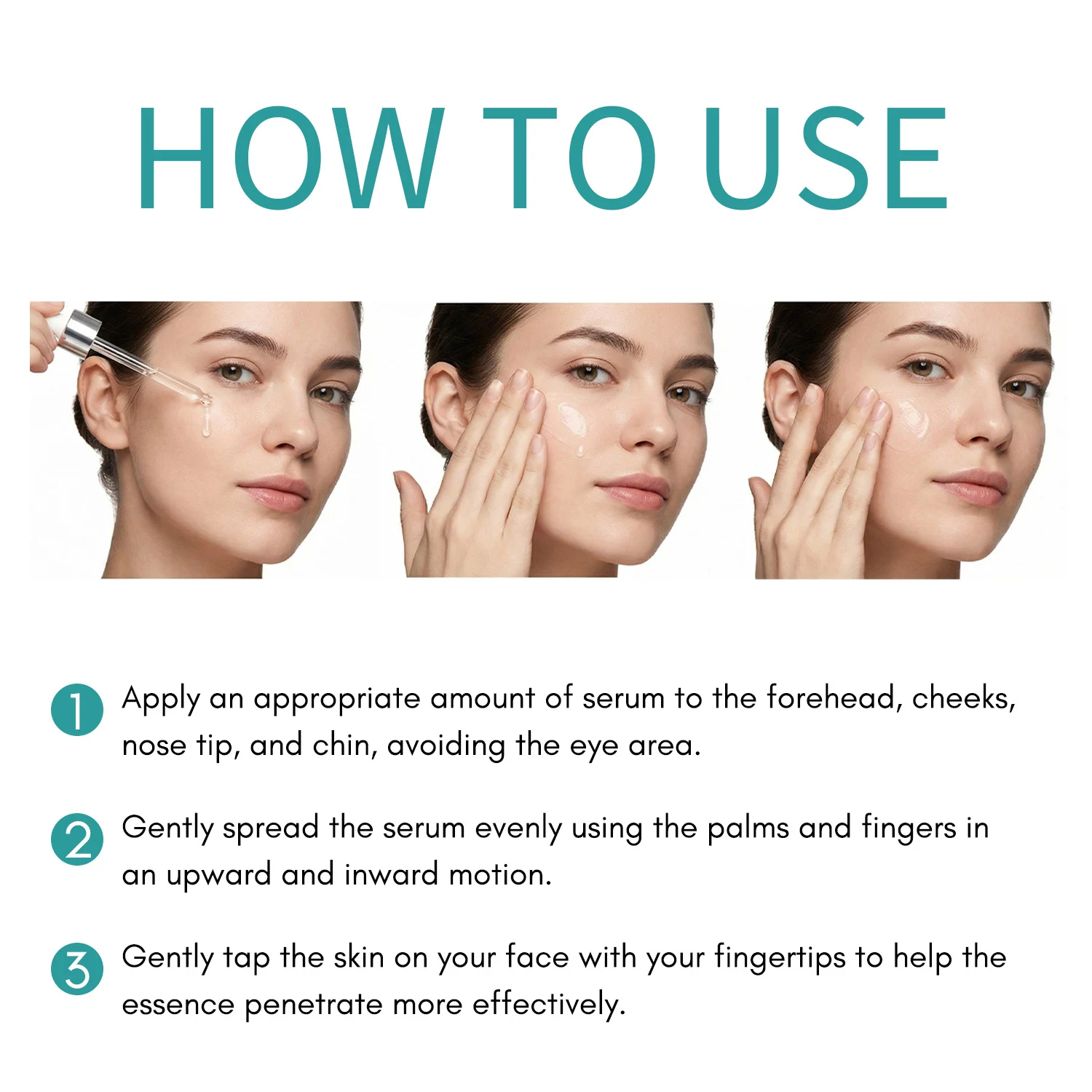 1. Apply an appropriate amount of serum to the forehead, cheeks, nose tip, and chin, avoiding the delicate eye area.