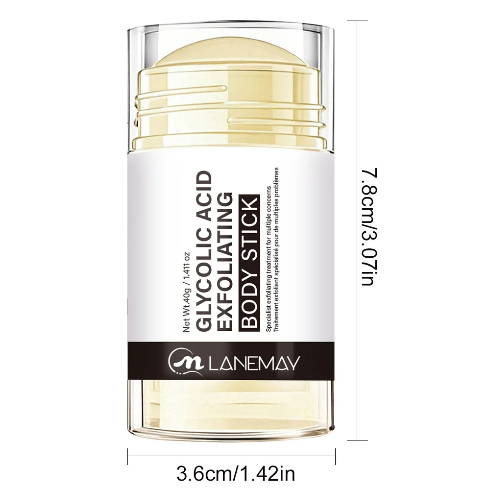 Transform rough, bumpy skin with the LANEMAY Glycolic Acid Exfoliating Body Stick. Designed for targeted application, this mess-free twist stick is your ultimate solution for “strawberry legs,” Keratosis Pilaris (KP) bumps, and ingrown hairs. Unlike messy scrubs or lotions, the balm texture glides on smoothly, delivering potent active ingredients exactly where you need them without leaving a greasy residue. It delivers visible smoothing results in as little as 7 days.