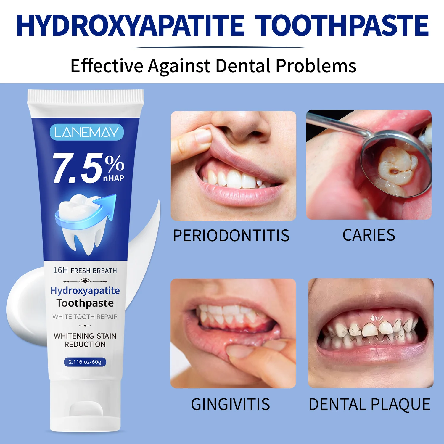 - Enamel Repair: Contains 7.5% Hydroxyapatite to help restore and strengthen tooth enamel.