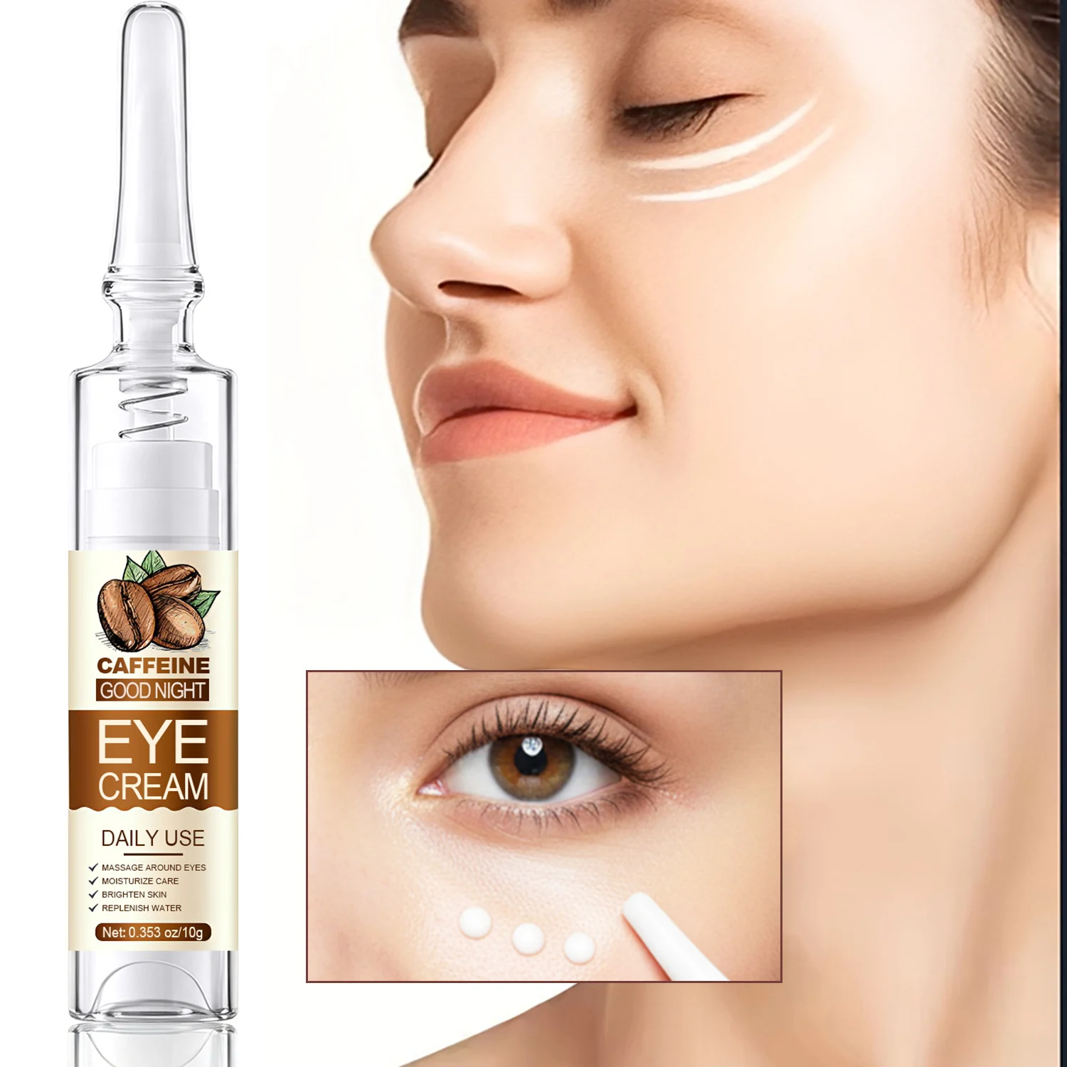 - Dispense: Squeeze out a small amount of eye cream (about the size of a grain of rice) around the eye area.