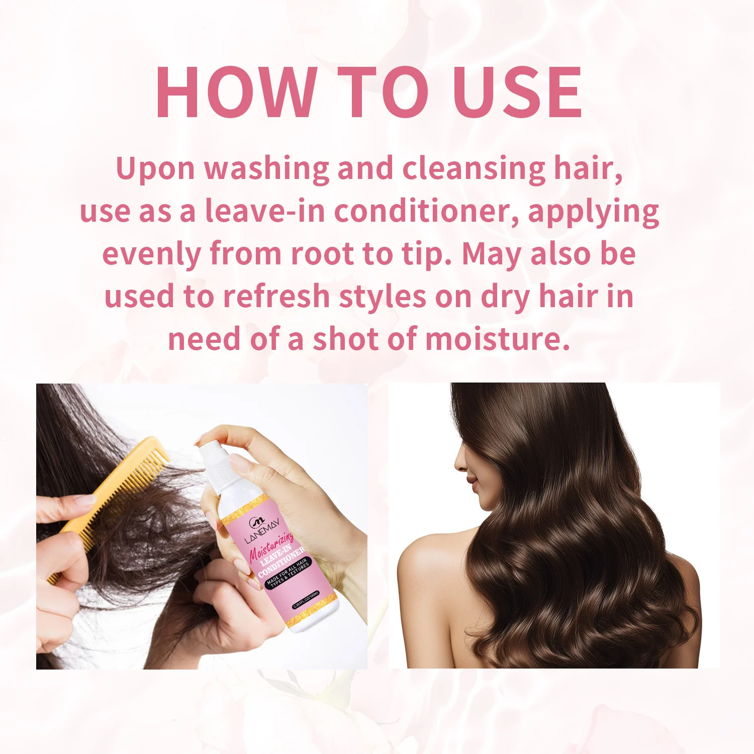 - After Washing: Spray evenly onto clean, damp hair from root to tip. Comb through to distribute. Do not rinse.