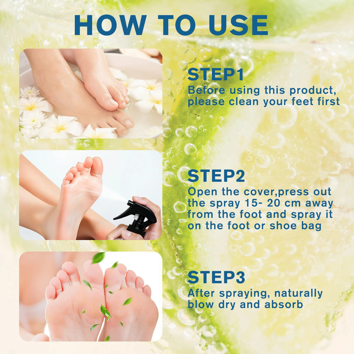 - Spray: Open the cover and hold the bottle 15-20 cm away from the foot. Press the pump to spray evenly on the foot or inside your shoes/shoe bag.