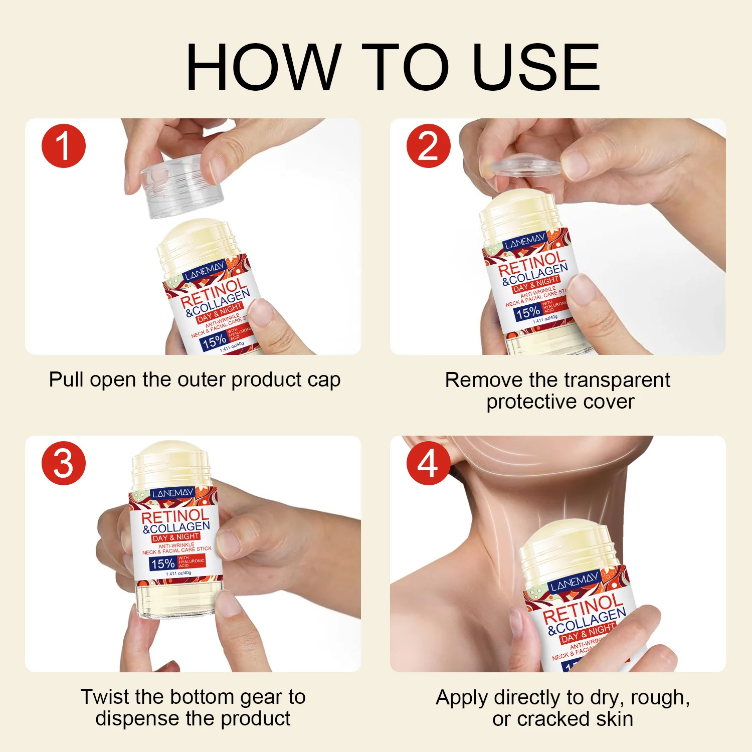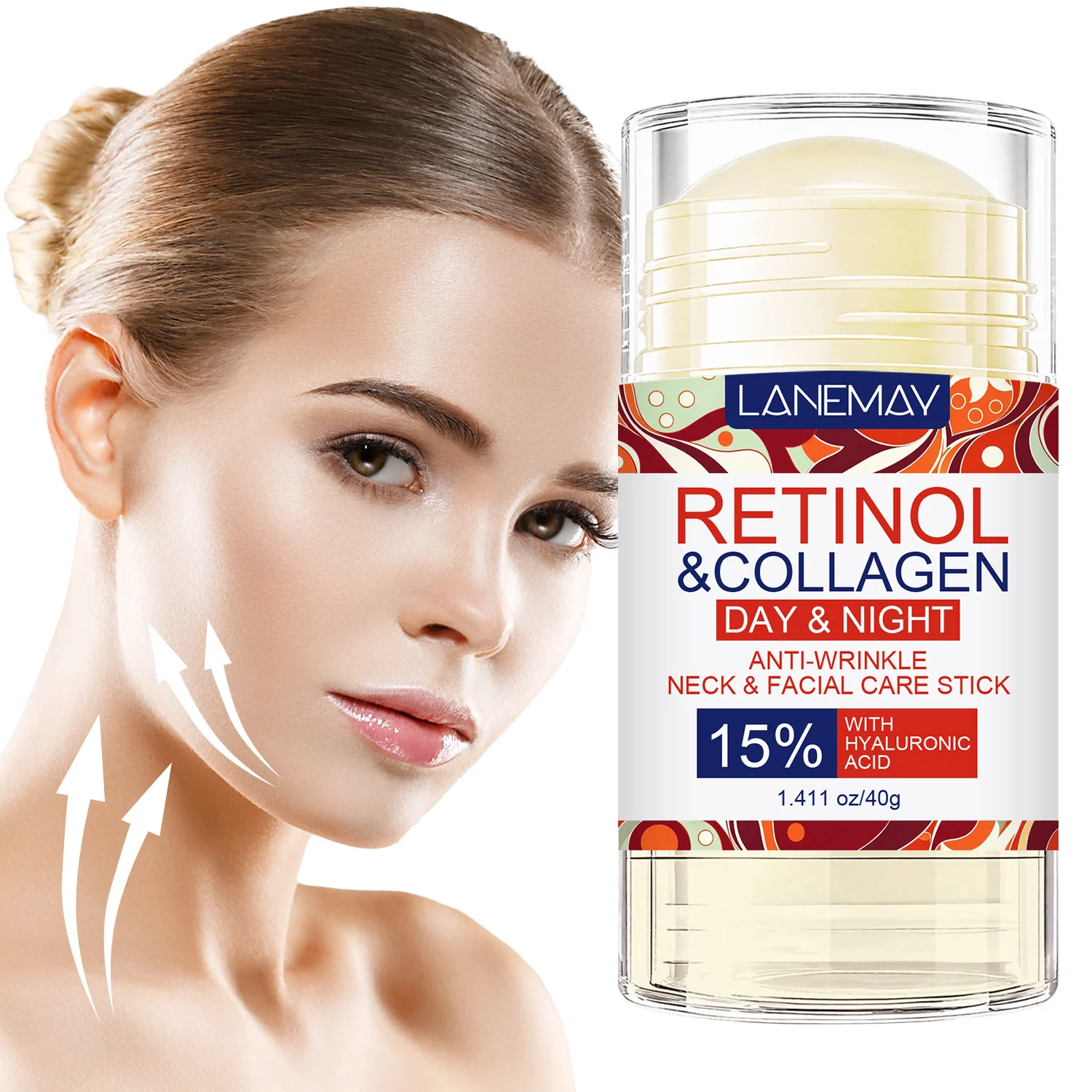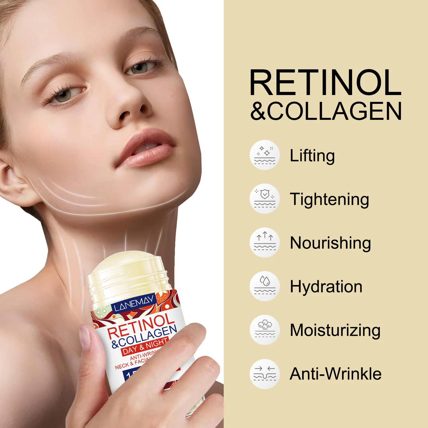 Experience the ultimate convenience in anti-aging skincare with the LANEMAY Retinol & Collagen Neck & Facial Care Stick. This innovative balm-stick is specifically formulated to target fine lines, wrinkles, and sagging skin on both the face and delicate neck area. Its non-greasy, refreshing texture melts into the skin, providing immediate hydration and long-term lifting benefits.