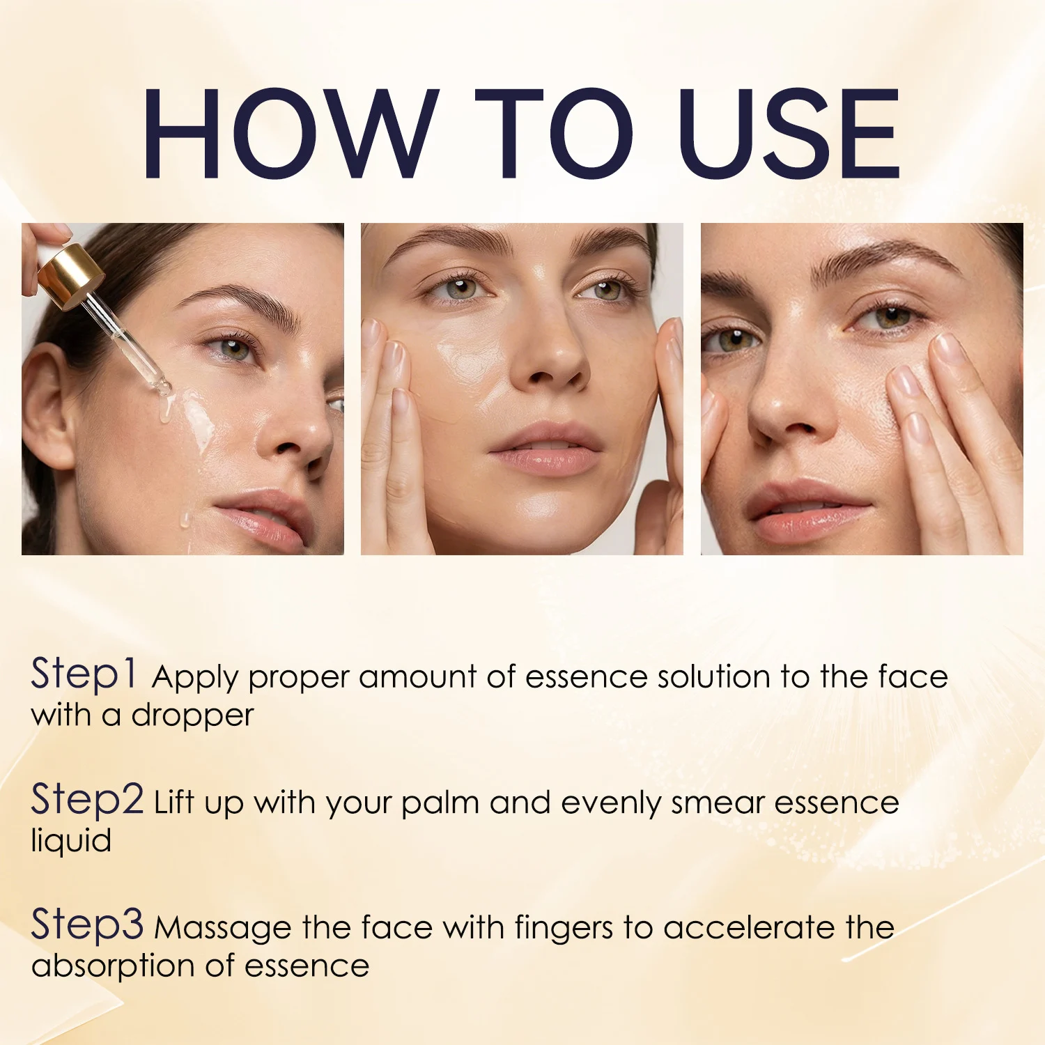 - Using the dropper, apply a few drops of the essence to your forehead, cheeks, and chin.