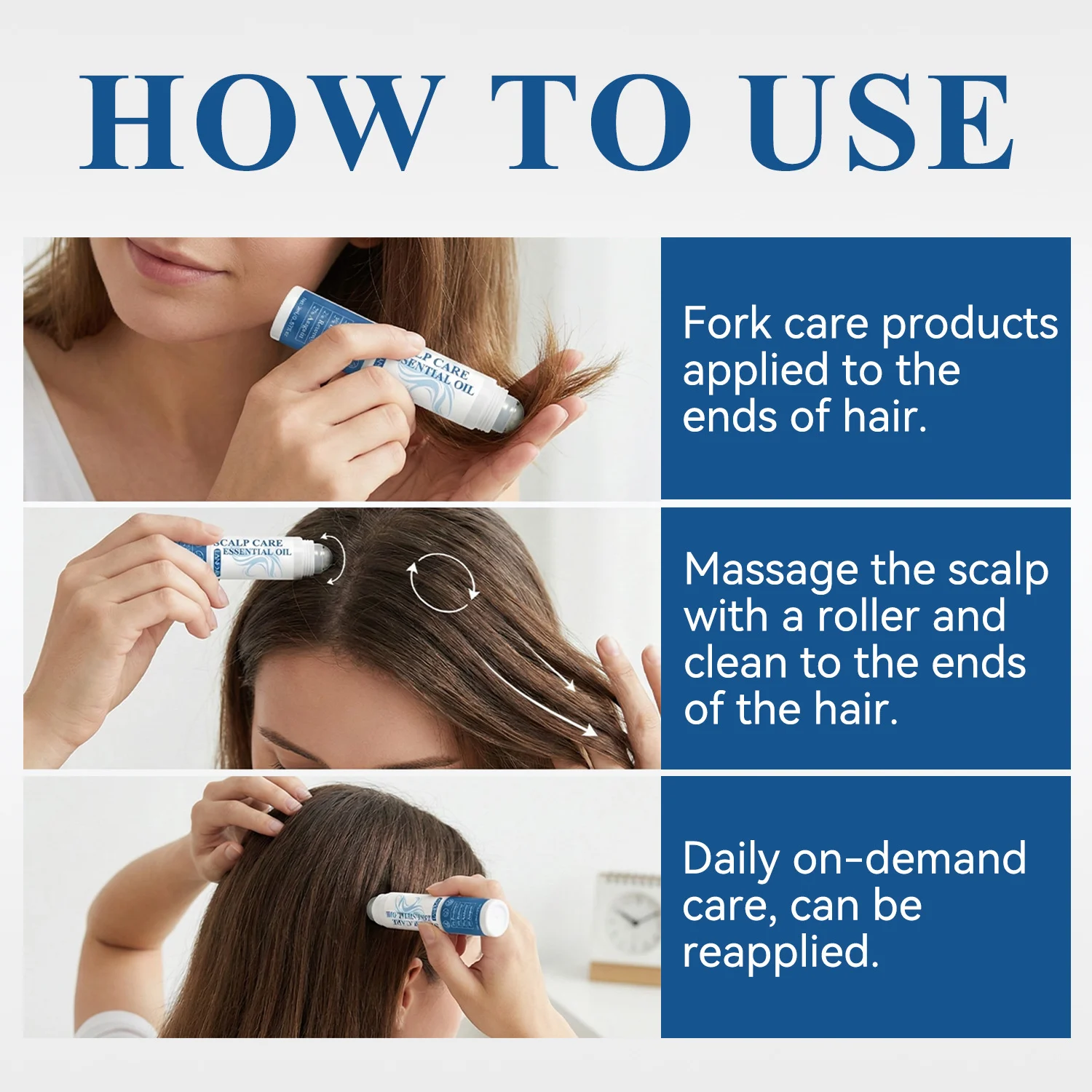 - Massage the scalp in circular motions with the roller to distribute the essential oil evenly.