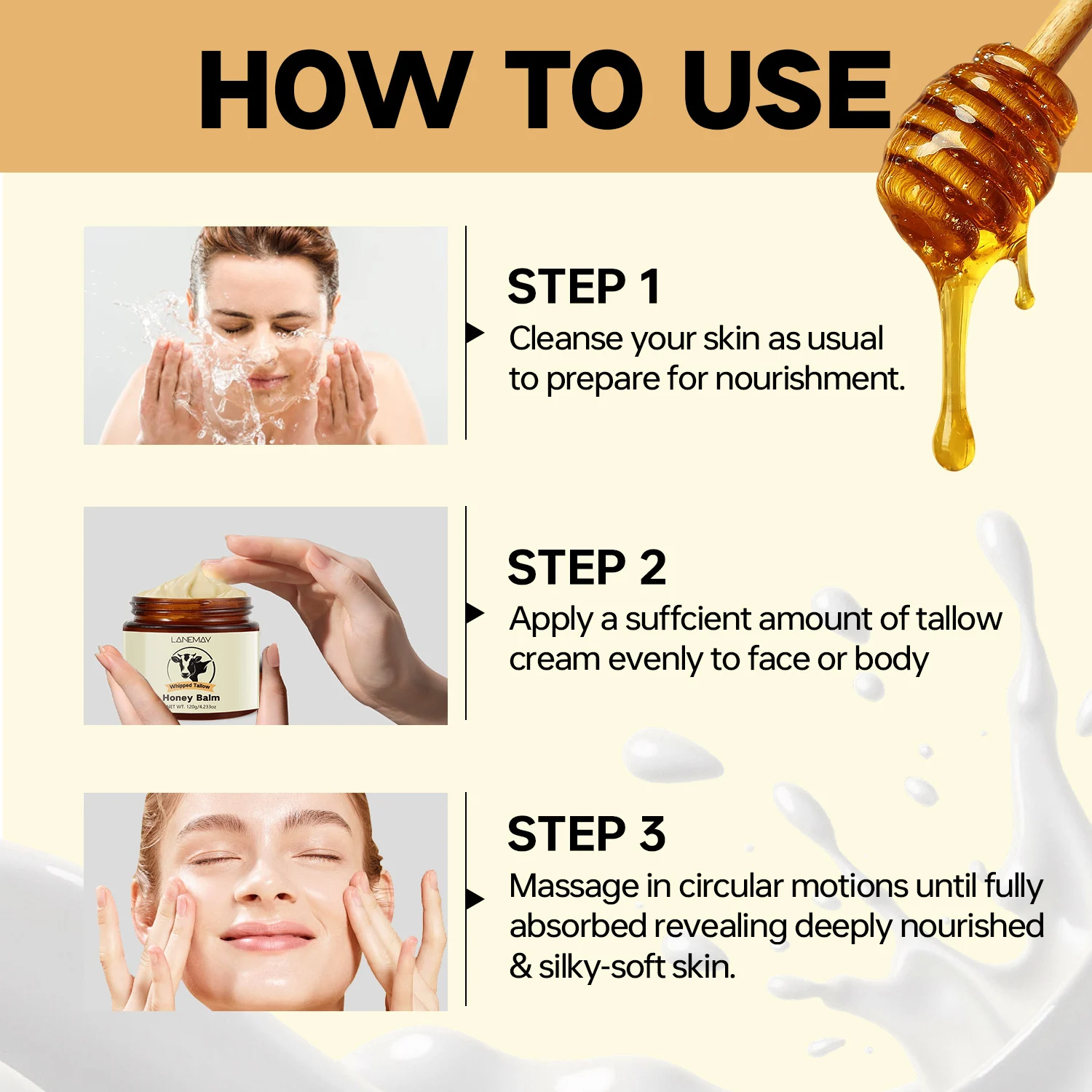 2. Step 2: Apply a sufficient amount of tallow cream evenly to the face or body.