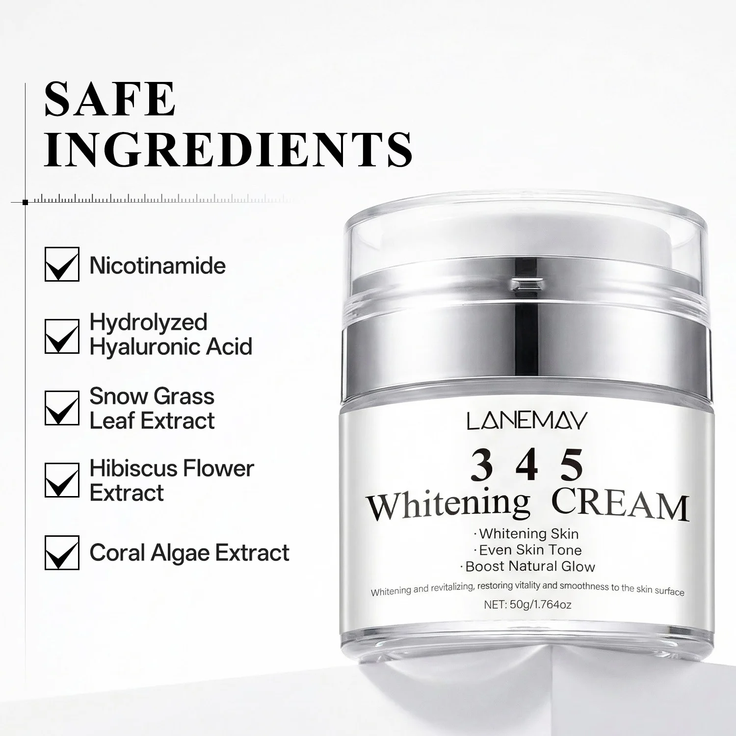 A: Yes, the LANEMAY Whitening Cream is formulated with safe, soothing ingredients like Snow Grass and Hyaluronic Acid, making it suitable for most skin types, including sensitive skin.