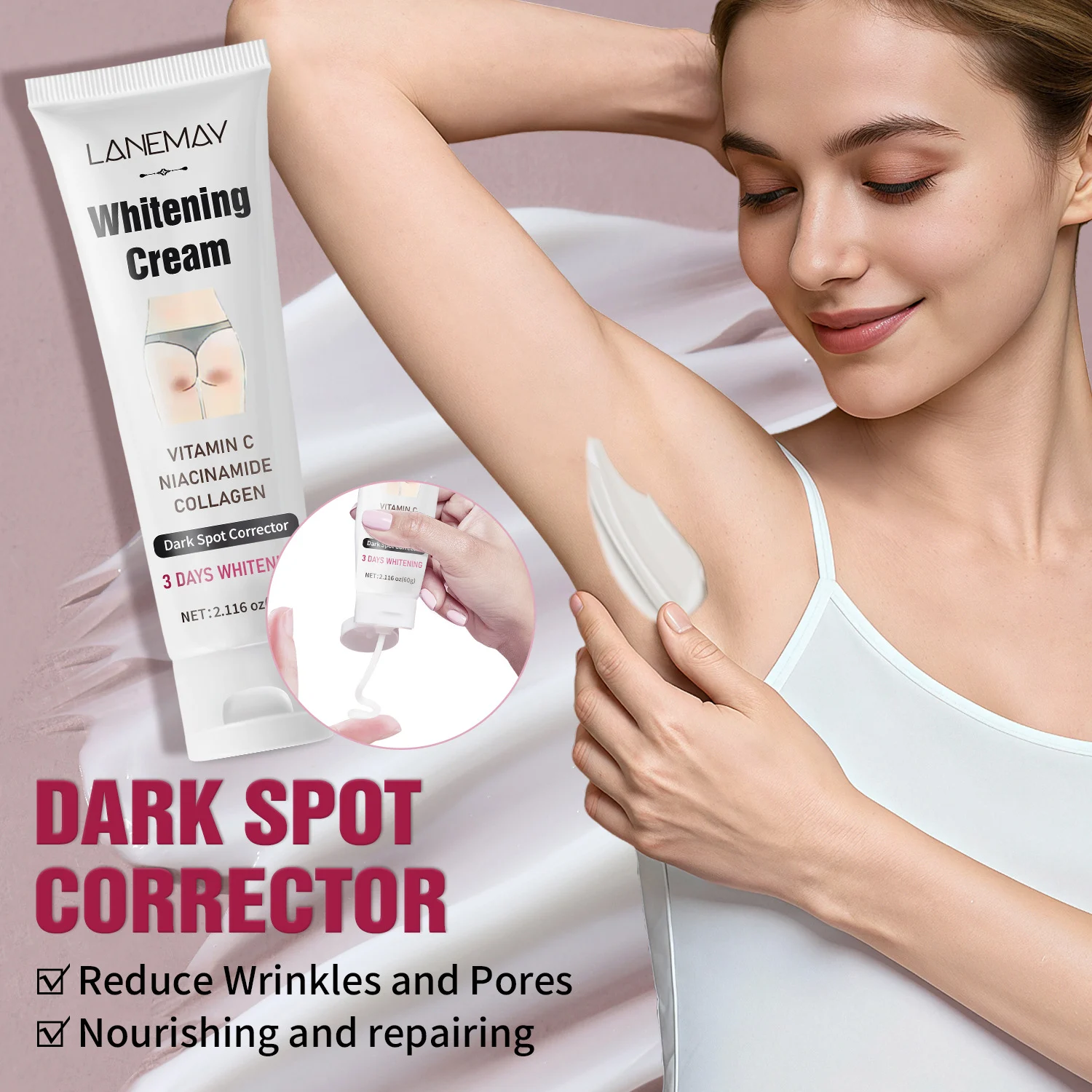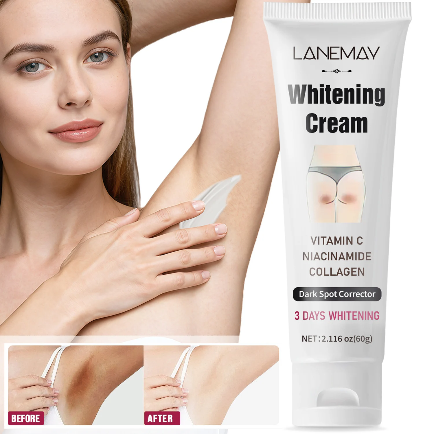 Experience a brighter, more even skin tone with the LANEMAY Whitening Cream. Specially formulated for delicate areas like the underarms, thighs, and knees, this powerful cream works to correct dark spots and nourish the skin simultaneously. Its fast-acting formula aims for visible results in just 3 days, leaving your skin feeling soft, smooth, and rejuvenated.